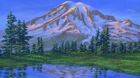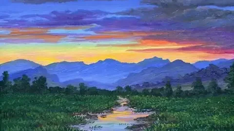 Как рисовать горы и озеро на закате, используя акрил на холсте